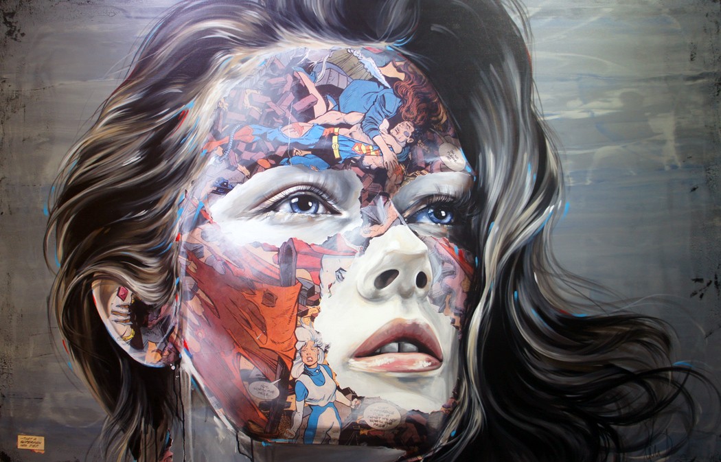 Yes, I started this “Cages” series, it was just like raw brush strokes on the face, I would paint a portrait and then you would have the contrast of large brush strokes on top, like they were trapped in a cage or in a prison. I stopped the series for a year because I wanted it to evolve, but I didn’t really know when. And then randomly – because I was not into comic books before – I often go to flea markets, and I just ended up buying some comic books, the Pop-art feel of it is interesting, the colors, the story, so I thought that it could be great. I just tried some studies on paper, and people really loved it.