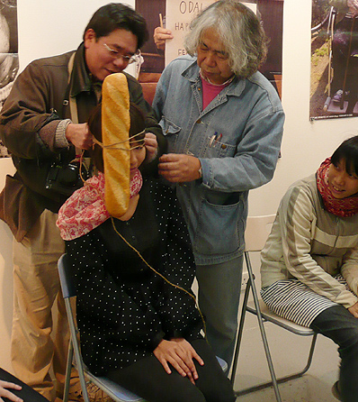The artist gave a short talk that sounded almost apologetic. He seemed to say: hey, people recognize me for this, and give my work attention because of this, so I have to keep on doing it. What he does is tie baguettes to people’s heads and then parades them around in public.