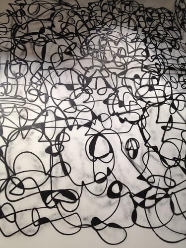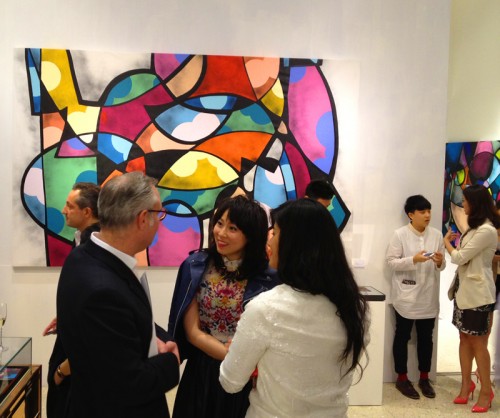 The artist, whose work combines influences from graffiti, as well as abstract expressionism, displayed essentially two types of paintings. The first have a sort of post-graffiti look that amplifies the swirl and movement similar to aerosol art; the second are made up of more deliberate, abstract expressionist patterns that somehow feel in the vein of geometric shapes by Miro, Kandinsky, and Calder.