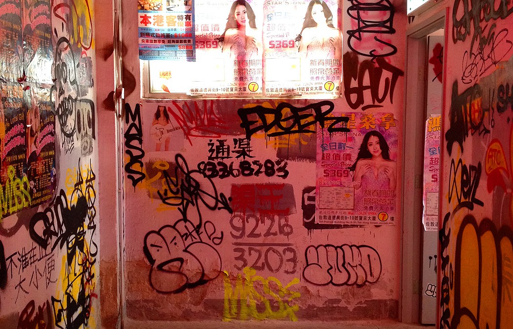 Under a florescent glow, visitors walk through a corridor covered in massage parlor posters and graffiti tags. A second short hallway mimics the look of Kowloon’s one-room brothels, with posters advertising services in local slang.