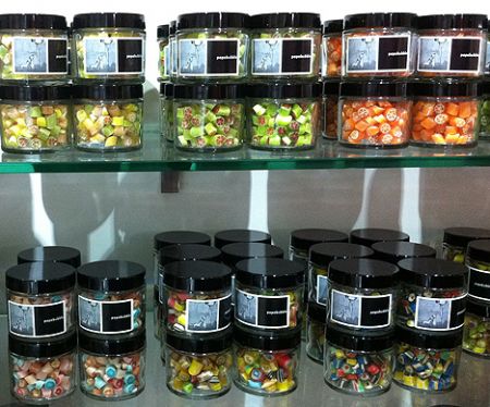 Display cases against both walls are used as a design element with backlit lighting that changes color.