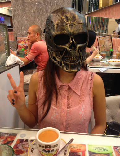 Wearing a full mask actually has two disadvantages: you can’t drink; and two, your friends won’t recognize you (this could also be an advantage!). I tried to cheat this rule once by using two jumbo bubble tea straws, but it didn’t work out very well!