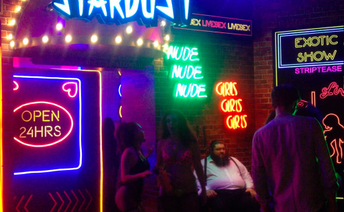Entering the club, the retro theme was a cross between Amsterdam’s red-light district and New York’s Times Square circa 1980, with live dancers, peepshow booths, and loads of neon signs.