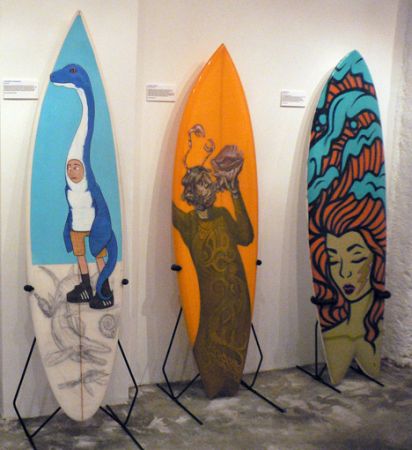 The narrow storefront was filled with fifteen surfboards painted by international artists including pro-skater Andy Howell, Australian artist Peter Webb, German artist Flying Fortress, Australian musician-artist Reg Mombassa, the UK Scrawl Collective’s Mr Jago, English artist Lucy McLauchlan, French illustrator Jean Linnhoff, and American artist Randy Noborikawa. Several local artists also contributed boards.