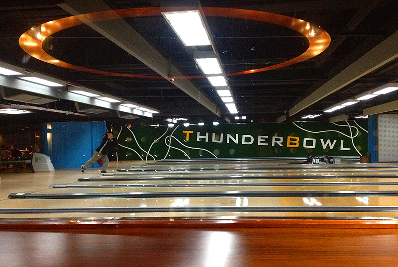 To get to Thunderbowl, take the elevator down to the basement level and follow the roar of flying pins.